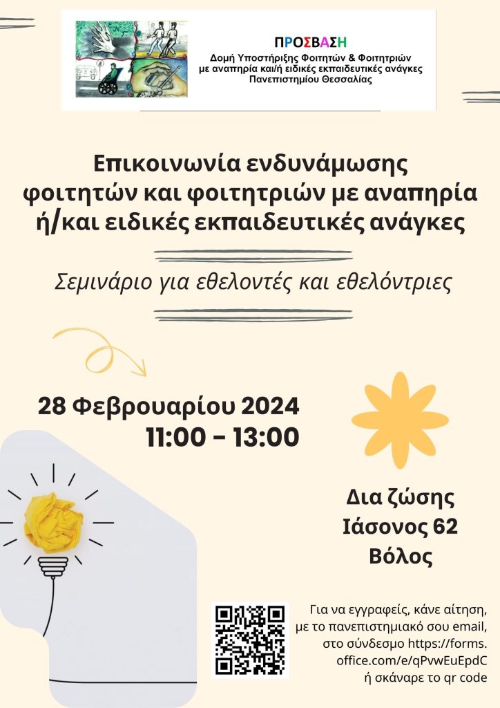 Γενικές Ανακοινώσεις 22-02-2024 Σεμινάριο ΠΡΟΣΒΑΣΗΣ με τίτλο: «Επικοινωνία ενδυνάμωσης φοιτητών/τριών με αναπηρία και/ή ειδικές εκπαιδευτικές ανάγκες». Λεπτομέρειες Δημιουργήθηκε : Πέμπτη, 22 Φεβρουαρίου 2024 13:02 Θα βρείτε εδώ τη σχετική ανακοίνωση και εδώ την αφίσα.